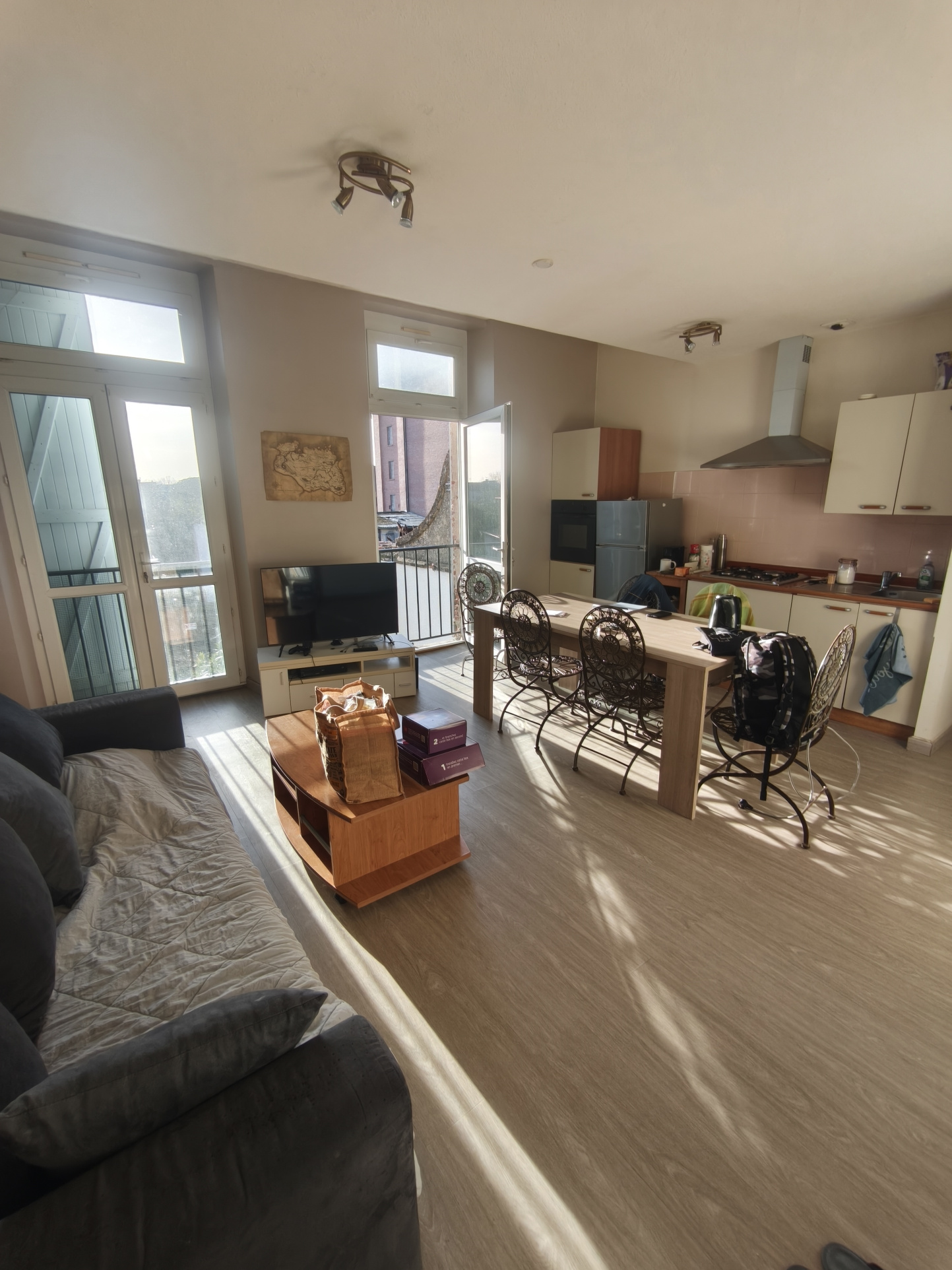 - en 1er étage, cuisine ouverte, chambre avec placards